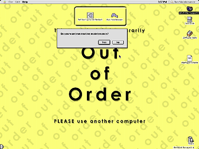 The computer then restarts, and boots up off the CD. We set the desktop pattern to a hideous yellow so it's easy to tell which computers in a Lab are running the CD. We also created an "Out of Order" desktop pic that will hopefully keep people from using the computers while they are running the scripts.