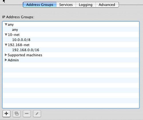 On Mac OS X Server (10.4) you have more options. You enable the firewall in Server Admin. In the Firewall service you have several tabs. The address group is where you set up different groups to set different rules. It also shows several groups setup already. The "any" group has "any" for IP, which is a valid setting for IPFW which means, "any" of course. 10-net and 192.168-net are private nets that is good to have rules for.