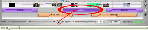 By: Mike Paladino - Revised: 2006-06-27 devinYou can edit the "amplitude envelope" of a clip by selecting the "Edit Volume" checkbox. A long horizontal line will appear in each audio track. This represents the volume envelope. To change the volume at a specific location, click on the line at that location. A yellow dot will appear. Drag that dot down or up to change the volume. To change how fast the volume change occurs, drag the smaller dot. To remove a dot, just click on it and press delete.